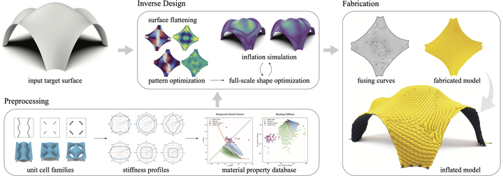 We apply our homogenization algorithm to create a database of geometrically diverse fusing patterns spanning a wide range of material properties and deformation characteristics. This database is employed in an inverse design algorithm that solves for fusing curves to best approximate a given input target surface. Local patches are selected and blended to form a global network of curves based on a geometric flattening algorithm. These fusing curves are then further optimized to minimize the distance of the deployed structure to target surface.