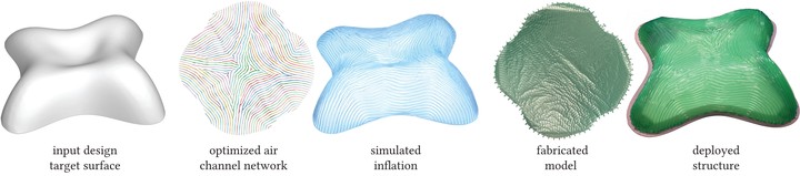We present a computational inverse design method for a new class of surface-based inflatable structure. Our deployable structures are fabricated by fusing together two layers of inextensible sheet material along carefully selected curves. The fusing curves form a network of tubular channels that can be inflated with air or other fluids. When fully inflated, the initially flat surface assumes a programmed double-curved shape and becomes stiff and load-bearing. We present a method that solves for the layout of air channels that, when inflated, best approximate a given input design. For this purpose, we integrate a forward simulation method for inflation with a gradient-based optimization algorithm that continuously adapts the geometry of the air channels to improve the design objectives. To initialize this non-linear optimization, we propose a novel surface flattening algorithm. When a channel is inflated, it approximately maintains its length, but contracts transversally to its main direction. Our algorithm approximates this deformation behavior by computing a mapping from the 3D design surface to the plane that allows for anisotropic metric scaling within the bounds realizable by the physical system. We show a wide variety of inflatable designs and fabricate several prototypes to validate our approach and highlight potential applications.
