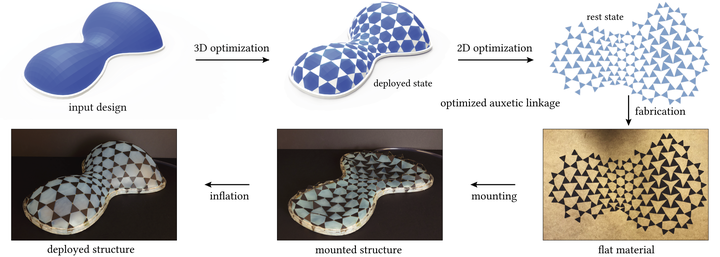 Deployable structures are physical mechanisms that can easily transition between two or more geometric configurations; such structures enable industrial, scientific, and consumer applications at a wide variety of scales. This paper develops novel deployable structures that can approximate a large class of doubly-curved surfaces and are easily actuated from a flat initial state via inflation or gravitational loading. The structures are based on two-dimensional rigid mechanical linkages that implicitly encode the curvature of the target shape via a user-programmable pattern that permits locally isotropic scaling under load. We explicitly characterize the shapes that can be realized by such structures—in particular, we show that they can approximate target surfaces of positive mean curvature and bounded scale distortion relative to a given reference domain. Based on this observation, we develop efficient computational design algorithms for approximating a given input geometry. The resulting designs can be rapidly manufactured via digital fabrication technologies such as laser cutting, CNC milling, or 3D printing. We validate our approach through a series of physical prototypes and present several application case studies, ranging from surgical implants to large-scale deployable architecture.