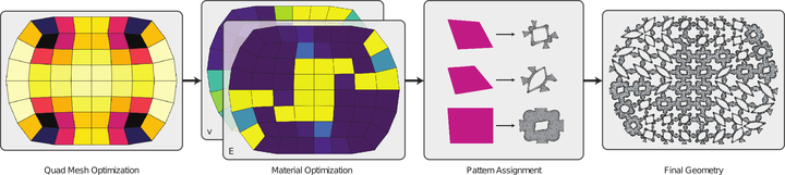 We propose a new approach to solving this problem for extruded, planar microstructures. Differently from existing methods for two-scale optimization based on regular grids with square periodic cells, which cannot conform to an arbitrary boundary, we introduce cell decompositions consisting of (nearly) rhombic cells. These meshes have far greater flexibility than those with square cells in terms of approximating arbitrary shapes, and, at the same time, have a number of properties simplifying small-scale structure construction. Our main contributions include a new family of 2D cell geometry structures, explicitly parameterized by their effective Young’s moduli 𝐸, Poisson’s ratios 𝜈, and rhombic angle 𝛼 with the geometry parameters expressed directly as smooth spline functions of 𝐸, 𝜈, and 𝛼. This family leads to smooth transitions between the tiles and can handle a broad range of rhombic cell shapes. We introduce a complete material design pipeline based on this microstructure family, composed of an algorithm to generate rhombic tessellation from quadrilateral meshes and an algorithm to synthesize the microstructure geometry. We fabricated a number of models and experimentally demonstrated how our method, in combination with material optimization, can be used to achieve the desired deformation behavior.